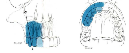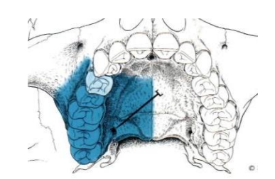 - Indiquée pour anesthésier les trois molaires maxillaires, sauf la racine mésiale de la 1ère molaire.