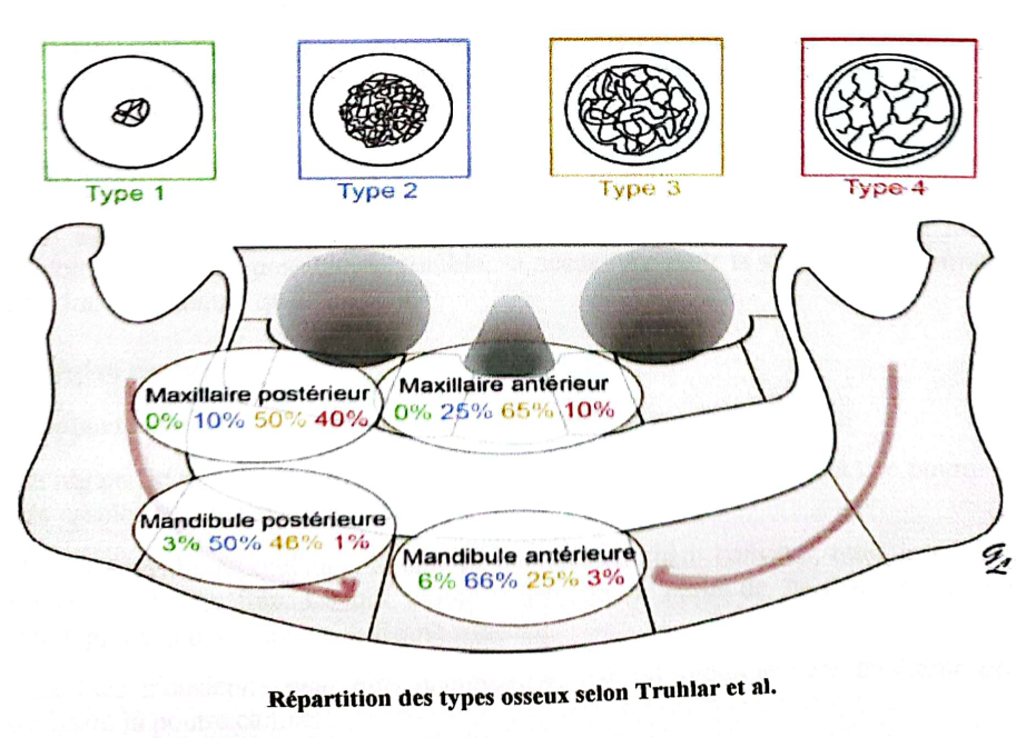 La qualité et la quantité des tissus durs doivent être analysés avec rigueur, le praticien prend en compte le type et la qualité de l’os avant de placer un processus d’implantologie de réhabilitation. Il existe différentes classifications de la qualité osseuse, on cite :