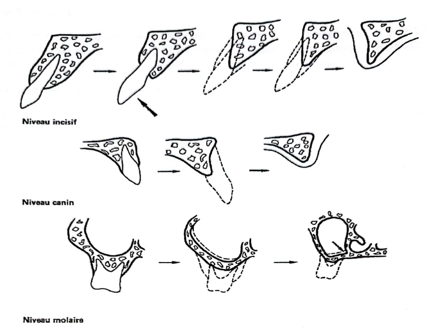 - Sur le versant vestibulaire, le degré et le sens de la résorption sont fonction de l’épaisseur de la table osseuse externe et de la manière dont les dents ont été extraites.