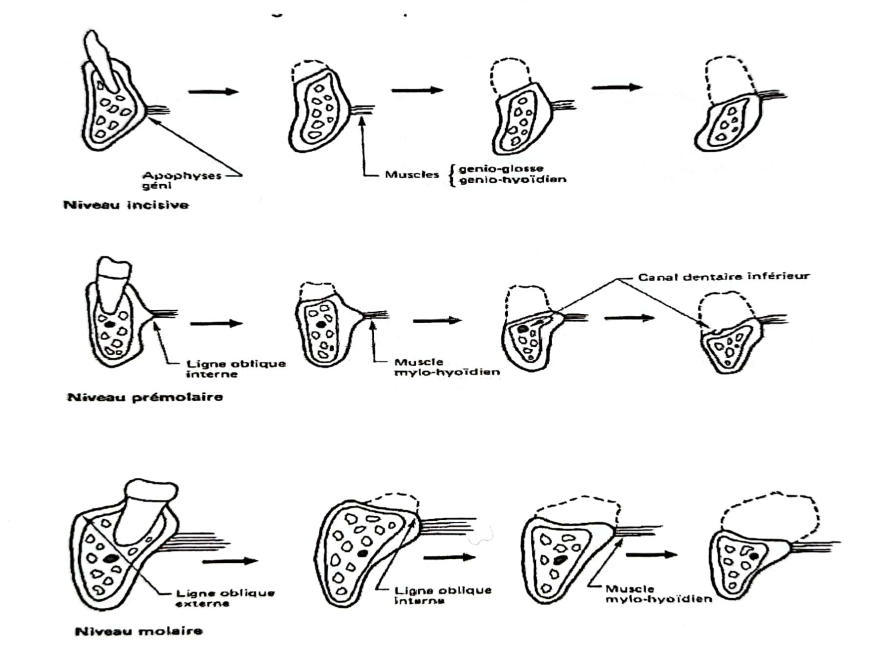 Résorptions de la mandibule : Après la perte des dents, l’organisation de la mandibule évolue en fonction des seules contraintes musculaires qui lui restent : le mylo-hyoïdien, les génio-glosses et les génio-hyoïdiens qui tractent la crête osseuse en direction linguale.- Au maxillaire, la résorption dans le sens vertical est associée à une résorption plus importante du côté vestibulaire (mouvement de résorption centripète).