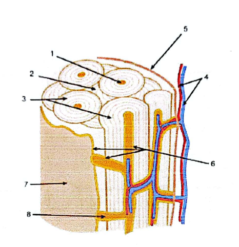 Organisation macroscopique du tissu osseux : 1. canal de Havers ; 2. système interstitiel ; 3. systèmes de Havers ; 4. vaisseaux sanguins ; 5. périoste ; 6. endoste ; 7. tissu osseux spongieux tapissant la cavité médullaire ; 8. canal de Volkmann.
