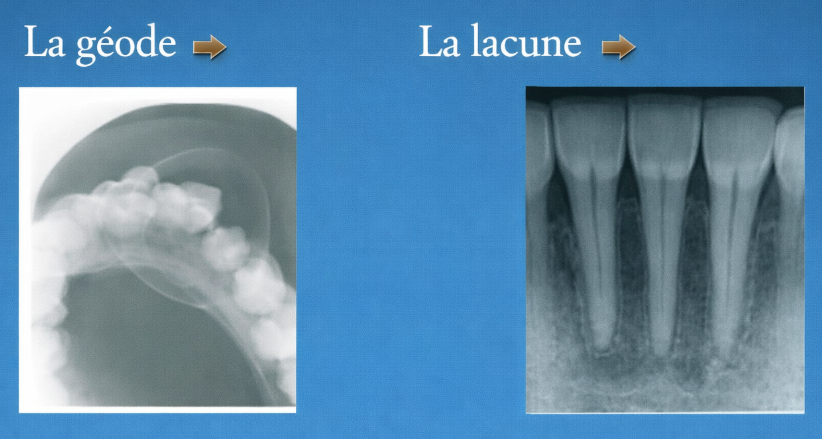 Description précise : Géode arrondie ou ovalaire, “appendue” à l’apex d’une dent nécrosée, cernée d’un liseré radio-opaque régulier.