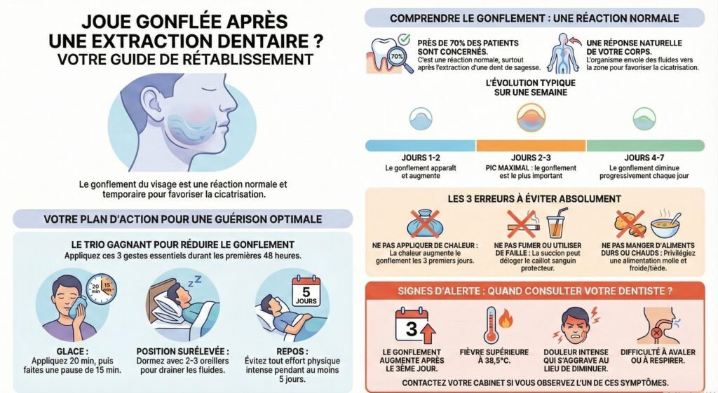 Mots-clés : joue gonflée extraction, gonflement après extraction dentaire, œdème post-extraction, réduire gonflement extraction, soins après extraction, dent de sagesse gonflement, combien temps gonflement extraction, glace extraction dentaire, complications extraction dentaire, alvéolite symptômes
