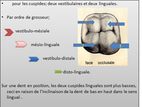 Les cuspides : 3 cuspides vestibulaires