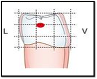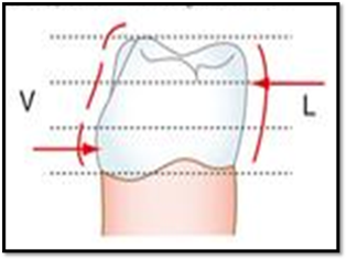 - La zone proximale de contact se situe à la jonction du tiers vestibulaire et du tiers médian (dans le sens vestibulo-lingual) et à la jonction du tiers occlusal et du tiers médian (dans le sens occluso-cervical).
