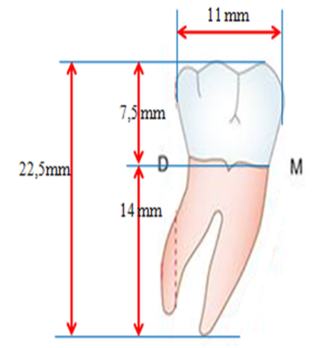 Ces dimensions montrent que la première molaire inférieure est une dent robuste, avec une couronne relativement large et des racines longues, assurant une stabilité mécanique importante.