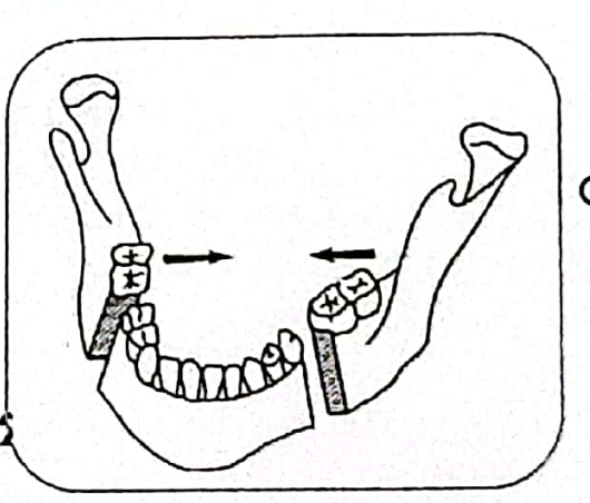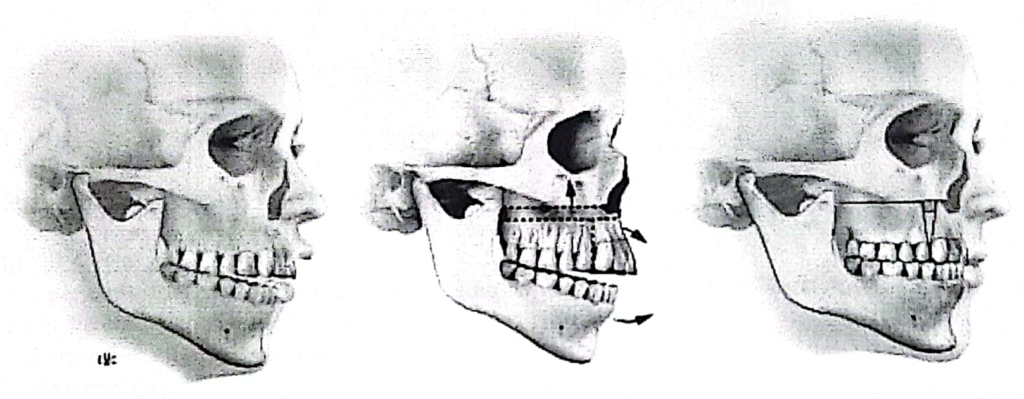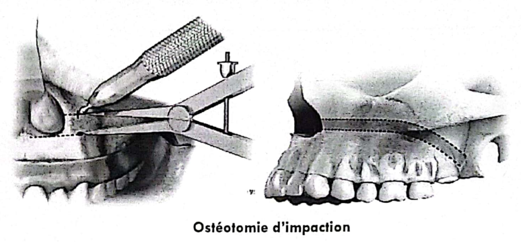 Le mouvement de recul est réalisé grâce à une résection effectuée de chaque côté dans la région PM après extraction. Lorsqu’il existe une béance osseuse, après avoir impacté postérieurement le maxillaire, On bascule alors le segment antérieur en direction palatine et une petite cale osseuse permet de maintenir le fragment en rotation.