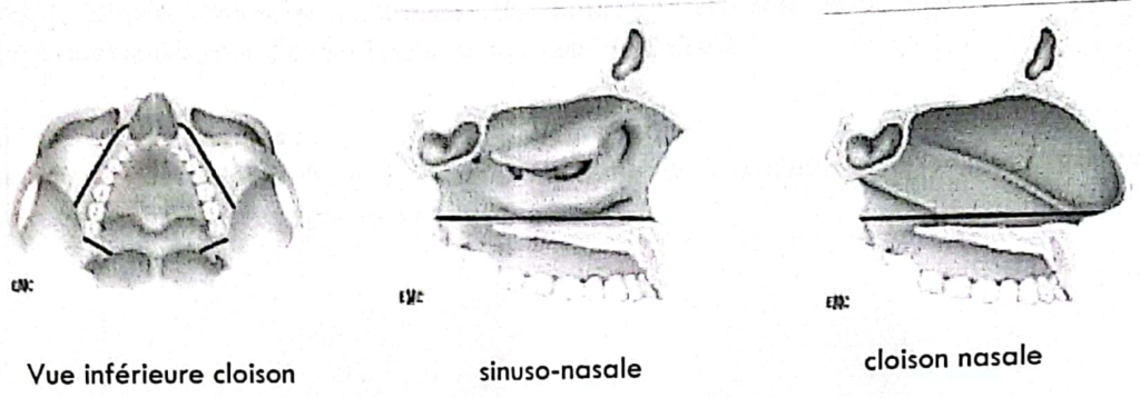 La voie d’abord : Afin de travailler sans être gêné par un saignement trop important, le vestibule Supérieur est infiltré avec 10 à 20 ml d’une solution adrénalinée, L’incision s’effectue quelques millimètres au-delà de la ligne de réflexion vestibulaire, sur le versant labial, afin de ménager une frange muqueuse indispensable à la qualité de la suivre. Elle peut s’étendre, latéralement, jusqu’au niveau molaire, en ayant eu soin de repérer l’osition de Sténon. Qu’il faut, bien entendu, éviter. La rugination va libérer tout le pourtour de l’orifice piriforme, le plancher des fosses nasales et le vomer sur ses deux faces. Elle s’étend, en haut, jusqu’au rebord orbitaire inférieur après avoir contourné l’émergence du pédicule infra-orbitaire. Latéralement, le dégagement s’étend jusqu’à l’attache antérieure du masséter et doit être doux vers la région prérygomaxillaire afin d’éviter l’issue de la boule de BICHAT. - Les Variantes :
