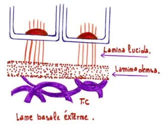 - Lamina lucida (15 nm d’épaisseur) : Zone claire finale avant les cellules