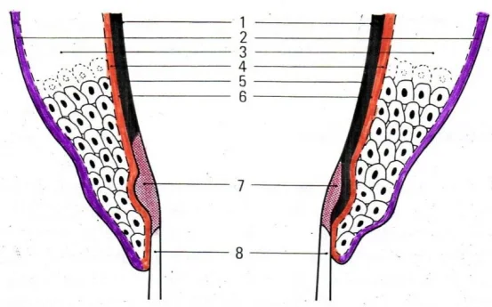Particularité anatomique : Au niveau apical (vers la pointe de la racine), l’épithélium s’amincit considérablement pour ne compter que 1 à 3 cellules d’épaisseur. Cette configuration reflète la dynamique de renouvellement cellulaire.