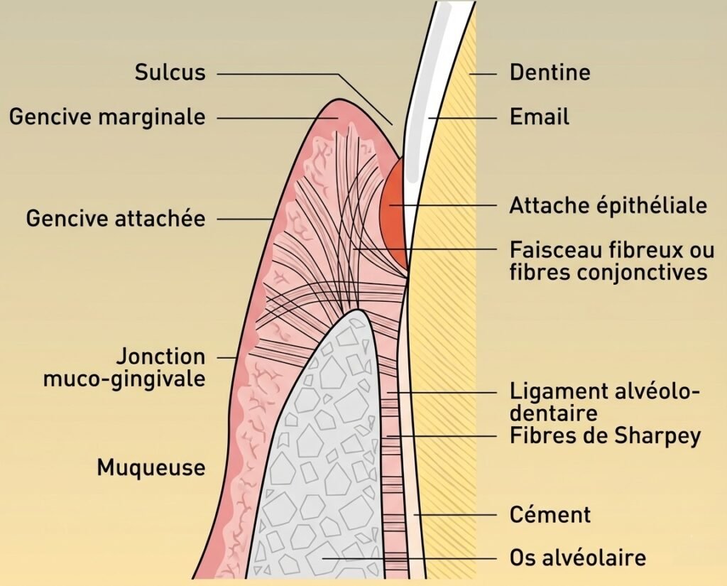 - Une barrière essentielle : L’attache épithéliale sépare le milieu intérieur de votre corps de l’environnement buccal, empêchant l’invasion bactérienne.