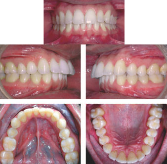 Les photographies endobuccales de face et latérales droite et gauche, complétées par des vues occlusales maxillaire et mandibulaire.