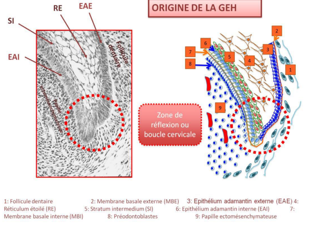 Ces cellules proviennent de la fragmentation de la gaine épithéliale de Hertwig lors du développement radiculaire. Appelées débris épithéliaux de Malassez, elles se localisent :