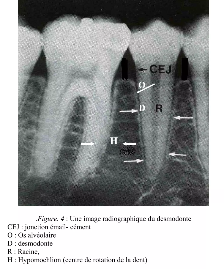 À la radiographie conventionnelle, le desmodonte se visualise comme une ligne radioclaire fine et régulière séparant :