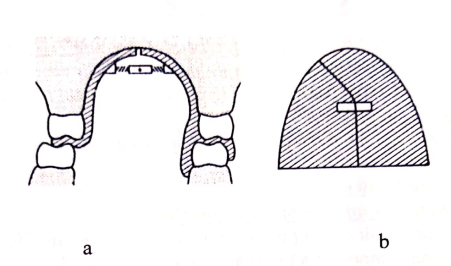 a) Appareil amovible avec vérin médian, pour la correction d’une endoalvéolie maxillaire asymétrique : surélévation et volets lingual et vestibulaire, au niveau du secteur en normoclusion.