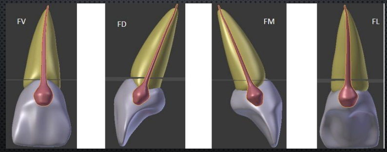 - Dans le prolongement, on retrouve un canal radiculaire ayant les mêmes inclinaisons que la racine.