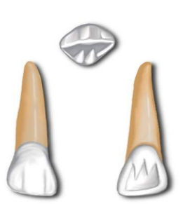 - La face vestibulaire de la couronne est légèrement plus inclinée dans le sens lingual que sur l’incisive centrale inférieure.
