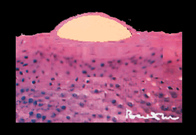 Élévation ronde et saillante d’un diamètre supérieur à 1 cm, correspondant à une infiltration cellulaire profonde du chorion.