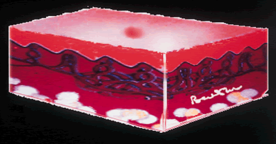 - Un corps muqueux de Malpighi (stratum spinosum). Les cellules sont de taille plus grande et commencent à s’aplatir (ce phénomène s’accentue au fur et à mesure que les cellules migrent vers la surface).