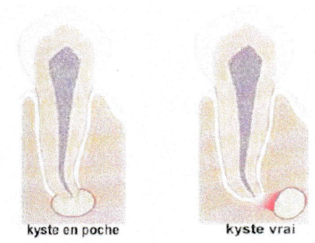 Les kystes radiculo-dentaires sont une réponse inflammatoire du péri-apex, qui se développe à partir de lésions chroniques avec préexistence de tissu granulomateux. (Transformation du granulome en kyste). On distingue :
