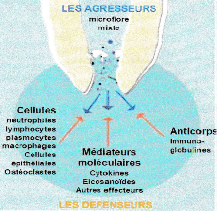 La parodontite apicale est le résultat d’une réaction inflammatoire à double tranchant défensive et agressive, c’est comme un combat dynamique entre l’agent agresseur de la pulpe intracanalaire et la défense de l’hôte dans le péri-apex.