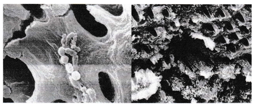 Bacilles et cocci sur la paroi canalaire et pénétrant les tubuli (microscope électronique à balayage).