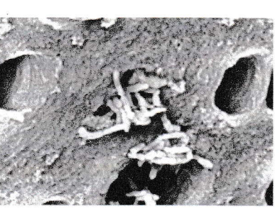 Bacilles et cocci sur la paroi canalaire et pénétrant les tubuli (microscope électronique à balayage).