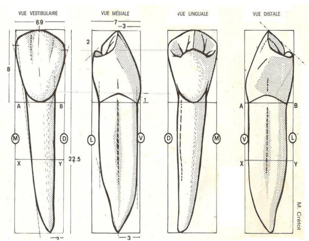 - Son contour est similaire à celui de la 1ère prémolaire, avec une légère inclinaison distale.