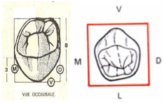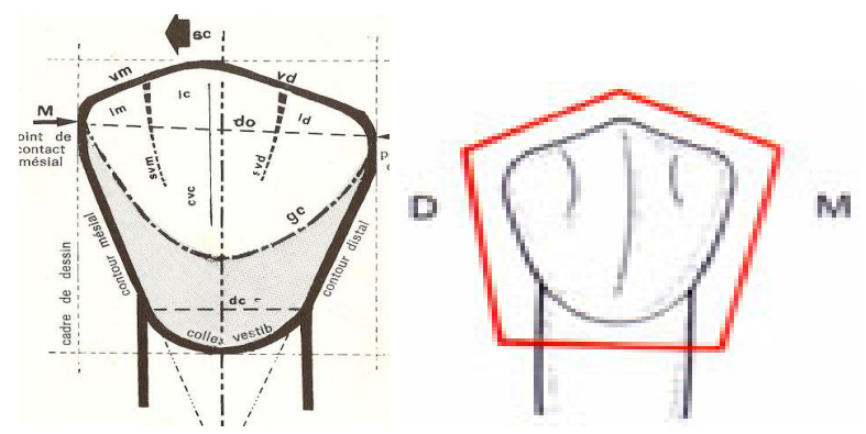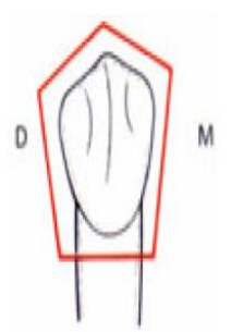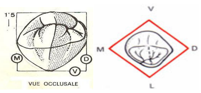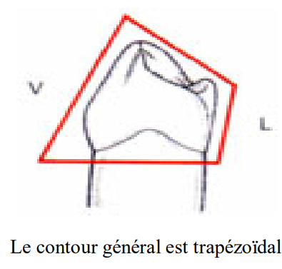 - Le contour général est sensiblement pentagonal, comme pour la canine et pour la 1ère prémolaire.
