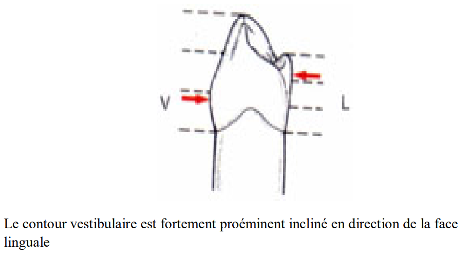 - Le contour vestibulaire est fortement proéminent, incliné en direction de la face linguale.
