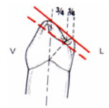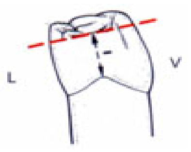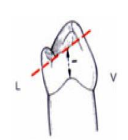 - La cuspide distolinguale occupe la moitié de la largeur de la cuspide mésiolinguale.