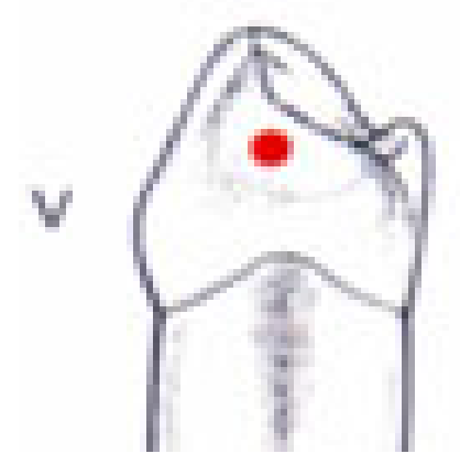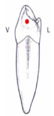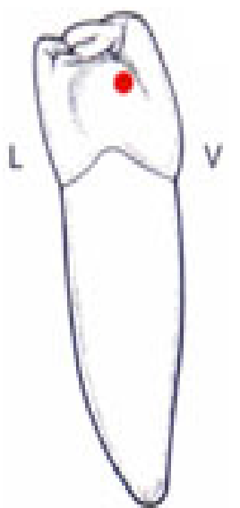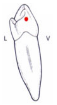 - Cette pointe peut se situer en regard de la pointe cuspidienne vestibulaire ou être décentrée.