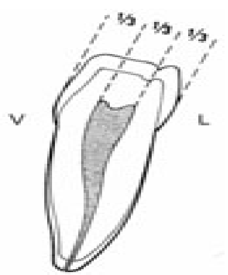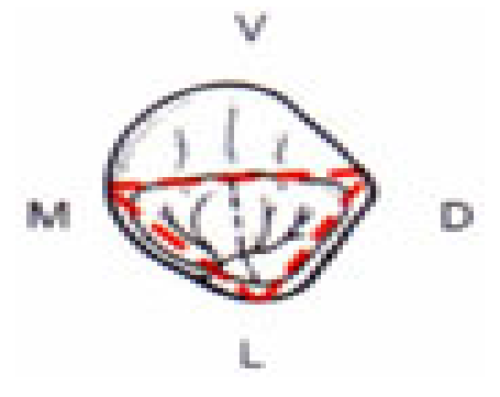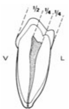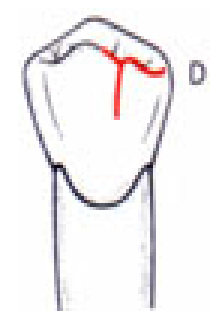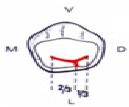 - Lorsque la dent présente 3 cuspides (modèle en Y), le sillon se divise en 3 bandes :