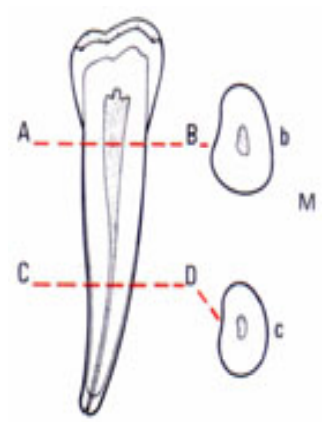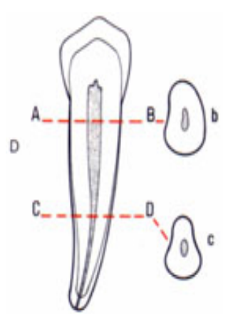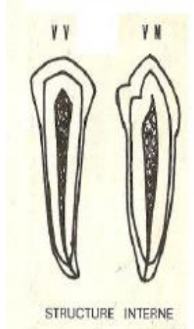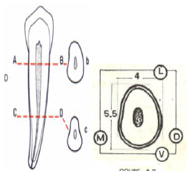 - La section radiculaire et la section canalaire sont toutes deux ovoïdes à grand axe vestibulolingual.