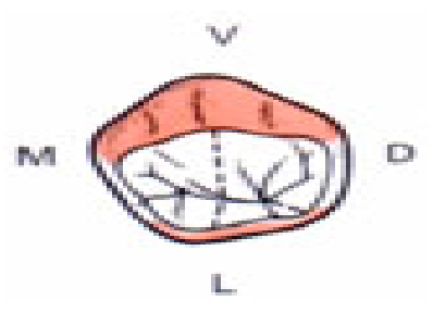 - Le contour vestibulaire est moins incliné en direction de la face linguale.