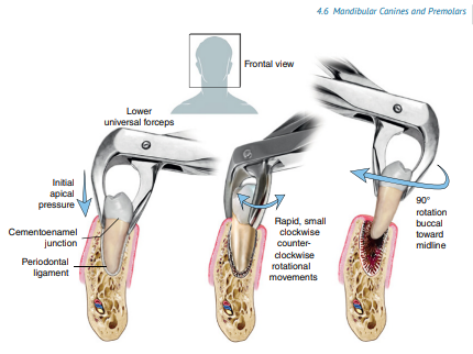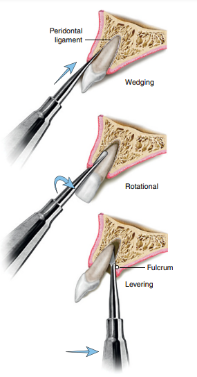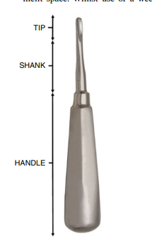 - L’instrument est introduit entre la racine et l’os alvéolaire, et agit comme un levier. La concavité s’adapte à la convexité de la racine, réalisant un véritable clivage de la dent de son tissu de soutien, le but étant d’aboutir à la mobilisation et l’élévation de l’organe dentaire.