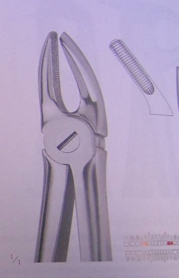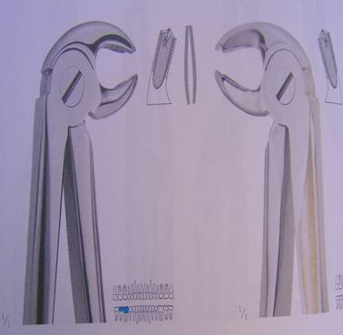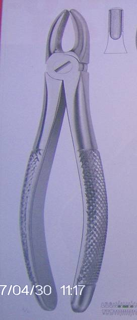 - Daviers pour 1re et 2e molaires : forme générale en S étiré, mores asymétriques (en vestibulaire, le mores possède un éperon médian qui s’insère dans l’espace interdentaire).