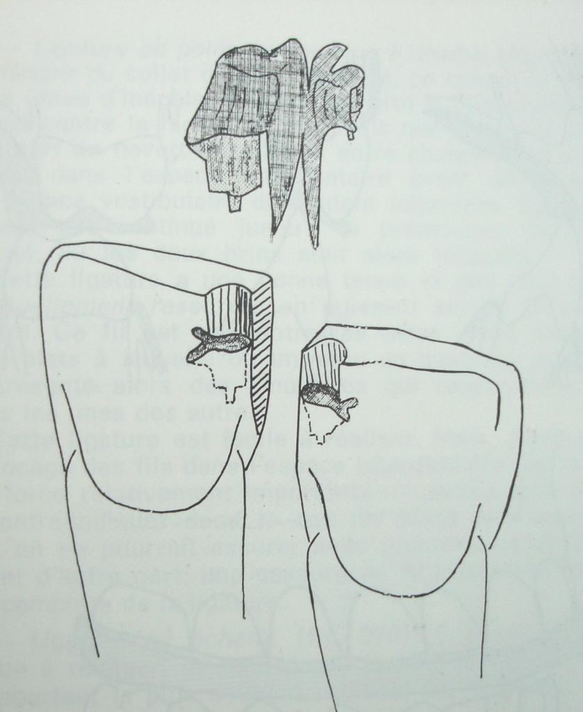 Non précisé.Solide, réglable, précise.Torons irritants, hygiène interdentaire difficile.Fil métallique (0,2-0,3 mm), fixation des montants lâchement, portions de fil de 5 cm glissées et torsadées dans les espaces interdentaires, serrage alterné et progressif, torons rabattus vers le bord.