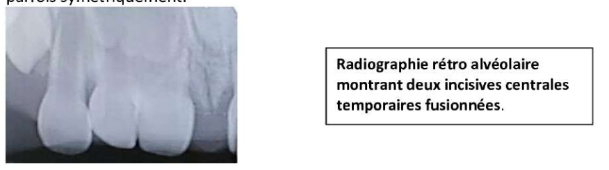 C’est une anomalie de développement constituée par l’union, le plus souvent par la dentine, de deux germes normaux au moment de leur formation. La fusion est plus fréquente en denture temporaire, en particulier en région incisivo-canine, parfois symétriquement.- Radiographie rétro-alvéolaire montrant deux incisives centrales temporaires fusionnées.