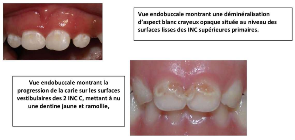 Appelée par les Anglo-saxons « nursing-bottle syndrome », « nursing caries », « baby bottle tooth caries », « bottle-mouth », « rampant caries », « early-childhood caries », la carie de la petite enfance (CPE) se traduit par la présence d’une ou plusieurs lésions carieuses (cavitaires ou non cavitaires), dents absentes (pour cause de caries), chez un enfant de moins de 6 ans (0-71 mois). Elle se caractérise par une atteinte tout d’abord des faces vestibulaires et palatines des incisives supérieures, entraînant des destructions très rapides de la couronne et s’accompagnant de mise à nu, le plus souvent indolore, de la dentine. - Étiologie