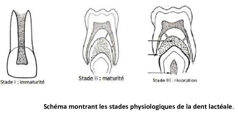 Schéma montrant les stades physiologiques de la dent lactéale.