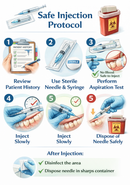 Technique : Introduction de l’aiguille à 30° par rapport au grand axe dentaire, insertion jusqu’à perception de résistance (2-4 mm de profondeur). Injection par poussées successives de faibles quantités.
