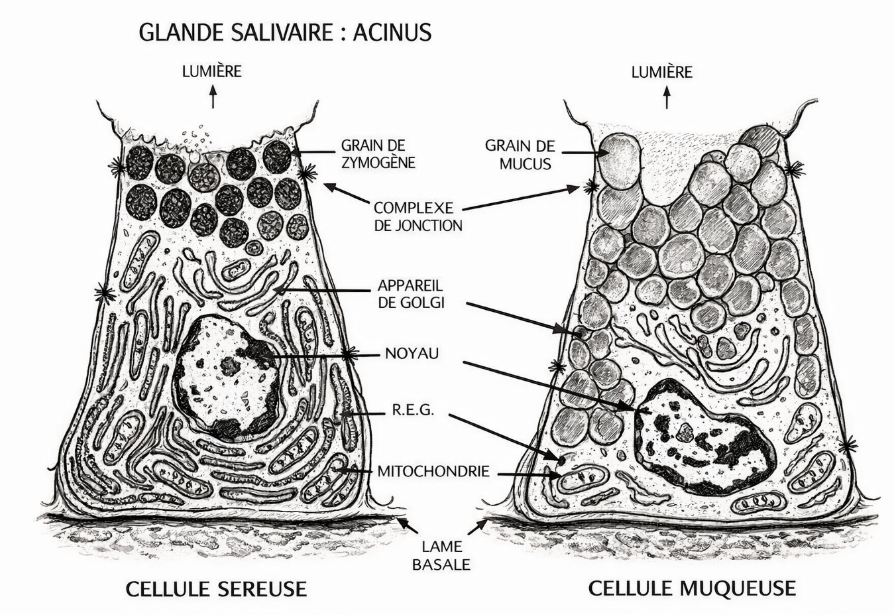 L’acinus est constitué d’un amas de cellules sécrétrices regroupées autour d’un canal collecteur appelé canal intercalaire. Autour des canaux intercalaires et des acini, se trouvent des cellules myoépithéliales (ne sont pas des cellules sécrétoires, mais sont des cellules qui, quand elles sont stimulées, se contractent, favorisent la sécrétion de la salive vers l’intérieur des acini). Les prolongements cytoplasmiques des cellules myoépithéliales contiennent des myofibrilles contractiles facilitant l’expulsion de la salive et participant ainsi à la régulation du débit sécrétoire.