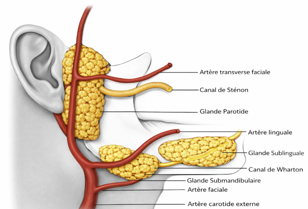 La vascularisation artérielle des glandes salivaires est assurée par différentes branches de la carotide externe : artères faciale et linguale pour les glandes sous-mandibulaires, artères sublinguale (branche de l’artère linguale) et sous-mentale (branche de l’artère faciale) pour les glandes sublinguales, et artère faciale pour les glandes parotides.